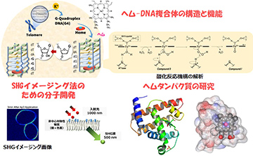 Studies on interfaces and condensed phases by linear and nonlinear molecular spectroscopy; Synthesis of emissive compounds and kinetic analyses of formation and deactivation processes of the emissive state by TCSPC; Studies on photofunctions and photochemical properties of newly fabricated molecular assemblies and inorganic particles in mesoscopic scale.